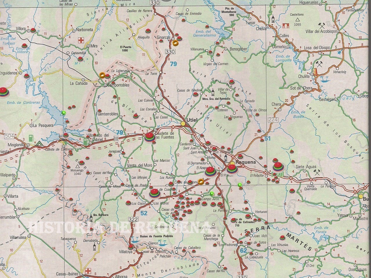 MAPA DE LOS POBLADOS IBÉRICOS DE LA MESETA DEL CABRIEL. Los círculos multicolor de tamaño grande, mediano y pequeño indican poblados según sus dimensiones; los marrones, necrópolis; y los verdes, santuarios.